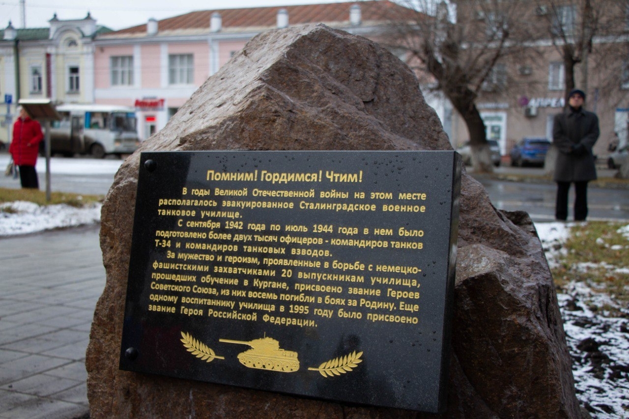 Губернатор Курганской области Вадим Михайлович Шумков поддержал инициативу Курганской областной общественной организации ветеранов (пенсионеров) войны, труда, Вооружённых Сил и правоохранительных органов об установке закладного камня на месте танкового училища. Был разработан макет и текст на мемориальную плиту. Областной совет ветеранов подготовил и направил необходимые документы на Комиссию по историческому наследию города Кургана.