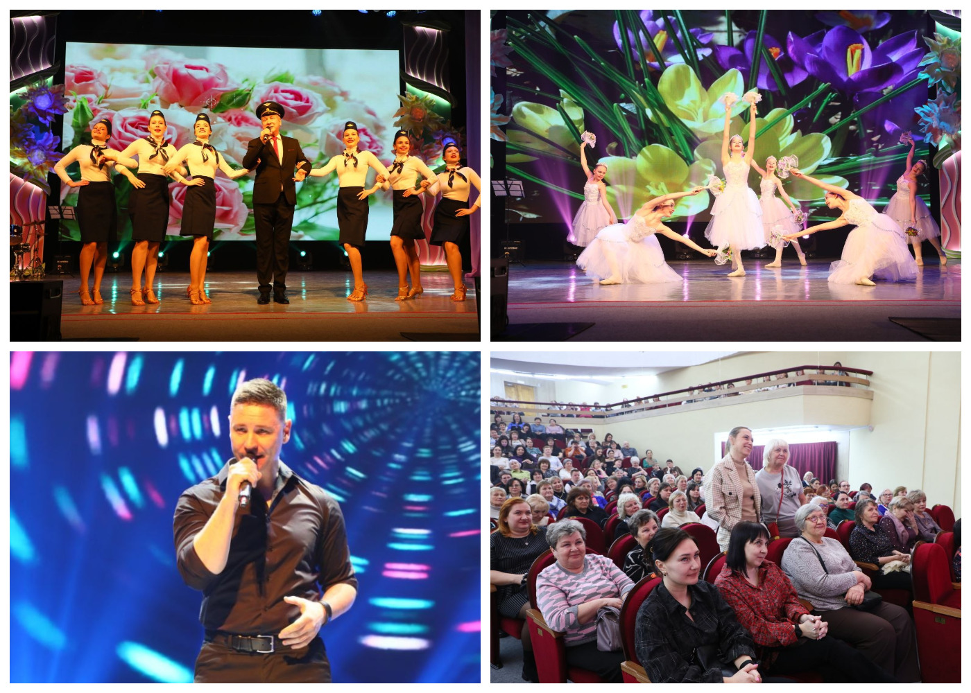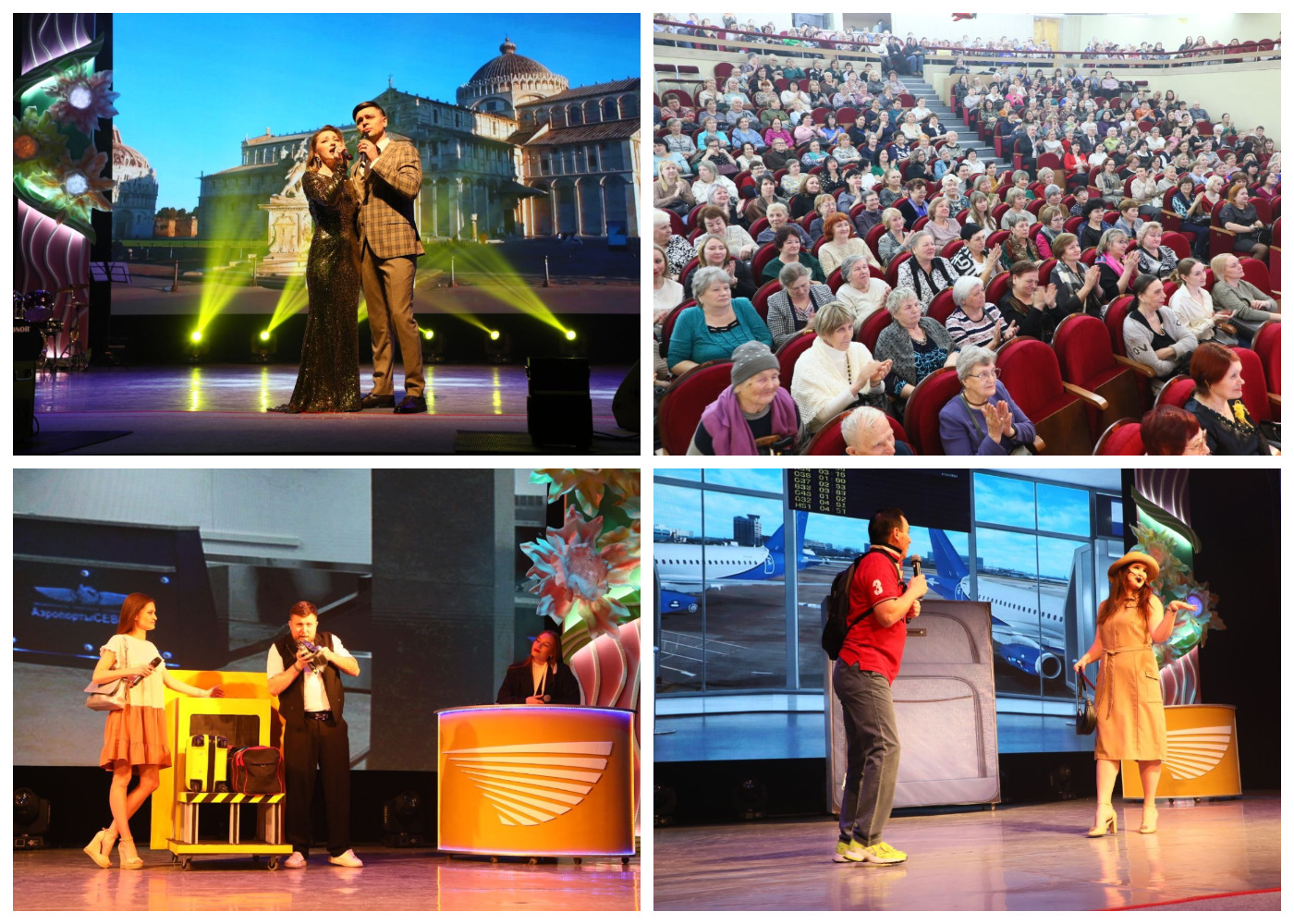 Два дня, 5 и 7 марта, концертный зал благоухал и сверкал от нарядных и улыбчивых женщин. Ведущий программы пригласил их… в импровизированный аэропорт. Где ж еще насыщеннее чувства и эмоции? И встречи, и расставания, и любовь — все вписалось в сценарий из песен, розыгрышей, реприз и танцев.