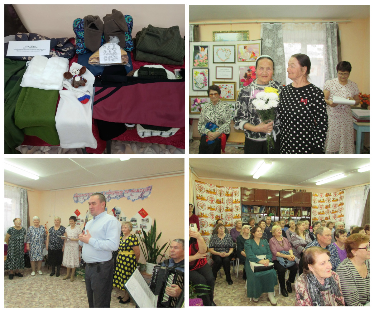 Зрители познакомились с изделиями волонтерской группы «Швейбат» Далматовского филиала Социальной защиты населения №3 (они отшивают более 50 изделий), их изделия отправляются в прифронтовой госпиталь и госпиталь в Ростове-на-Дону.