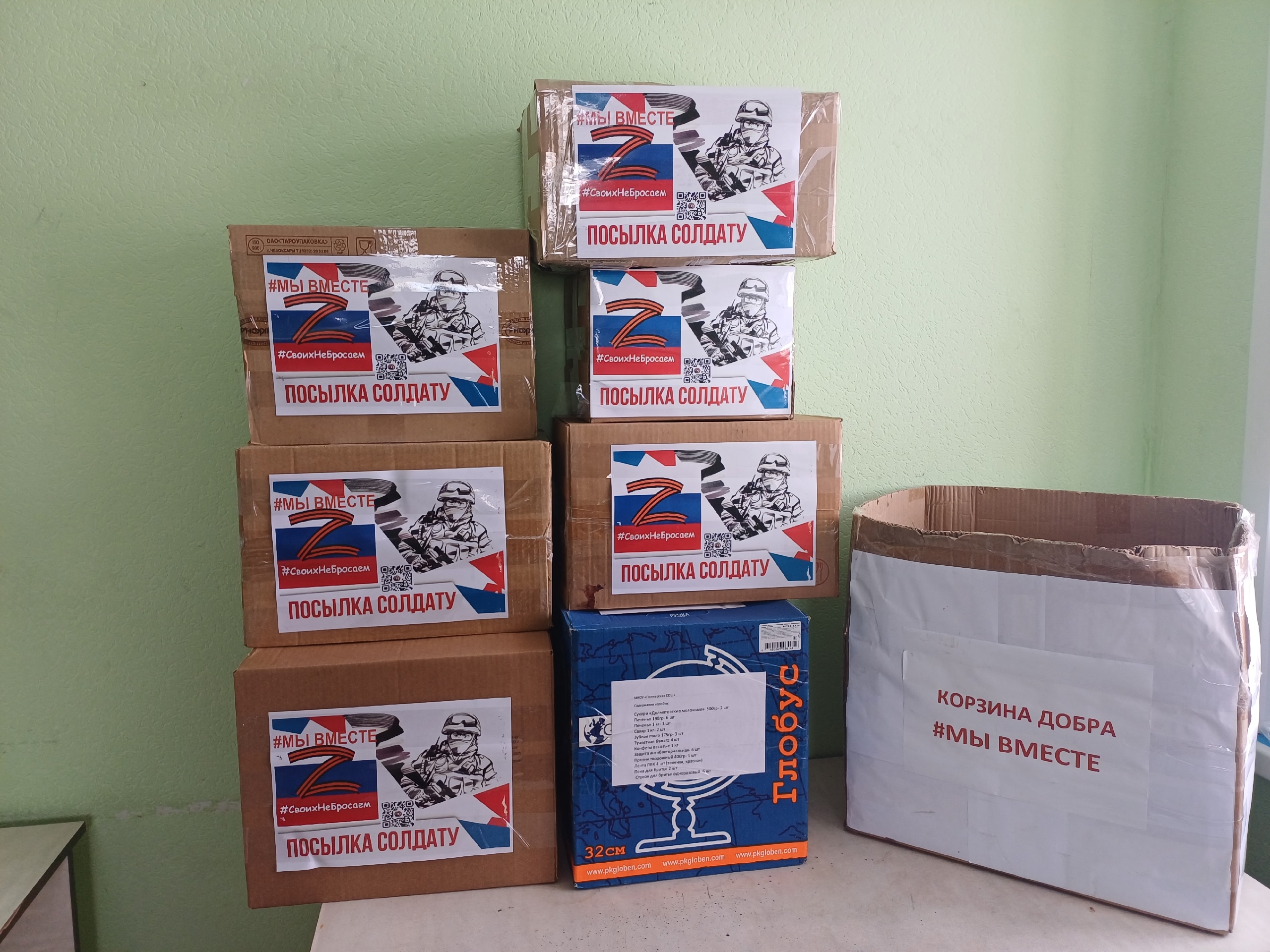 Внутри: домашние сладости, продукты длительного хранения, предметы гигиены и, самое ценное, — детские письма со словами поддержки для наших бойцов.