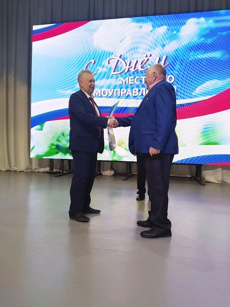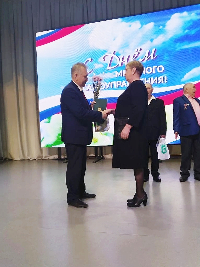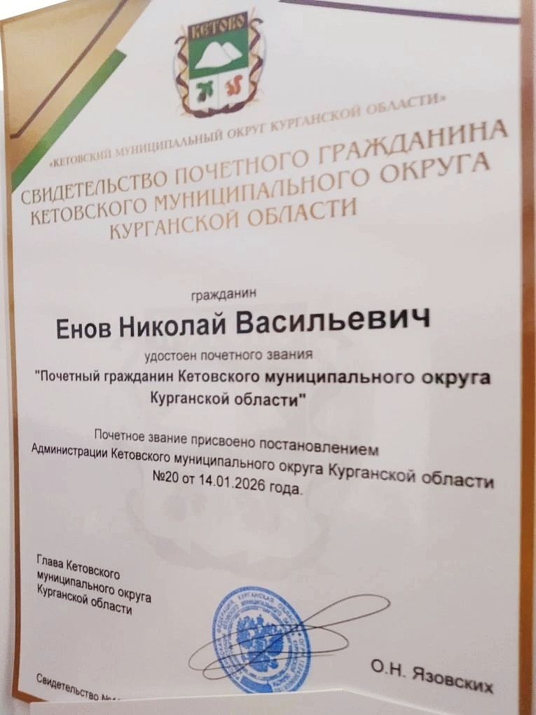 В День местного самоуправления были вручены свидетельства о присвоении звания Почетный гражданин Кетовского муниципального округа Енову Николаю Васильевичу - председателю первичной ветеранской организации с.Светлые поляны и Михнюк Наталье Владимировне - председателю первичной организации с.Митино.