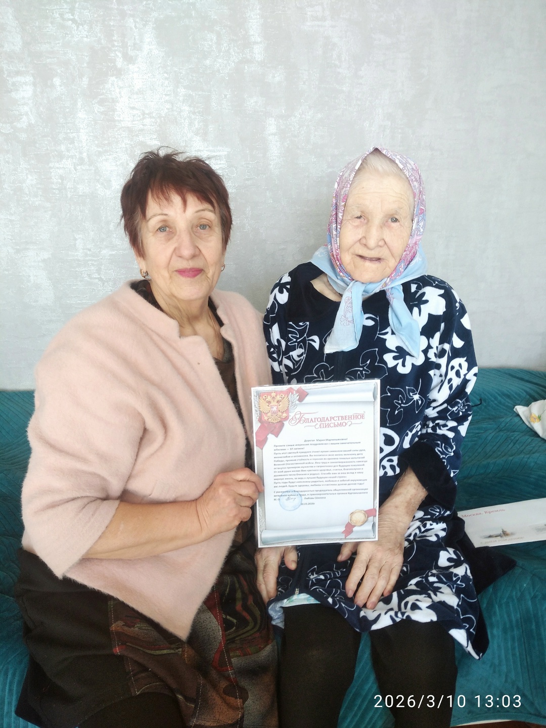Дорогая Мария Мартемьяновна! Примите самые искренние поздравления с вашим замечательным днем рождения! Пусть этот светлый праздник станет ярким символом Вашей силы духа, жизнелюбия и оптимизма. Вы посвятили свою жизнь великому делу Победы, проявив стойкость и героизм во времена тяжелых испытаний Великой Отечественной войны. Ваш труд и самоотверженность навсегда останутся примером мужества и патриотизма для будущих поколений. От всей души желаю Вам крепкого здоровья, счастья, благополучия и душевного тепла близких и родных. Спасибо вам за ваш вклад в нашу мирную жизнь, за веру в лучшее будущее нашей страны.