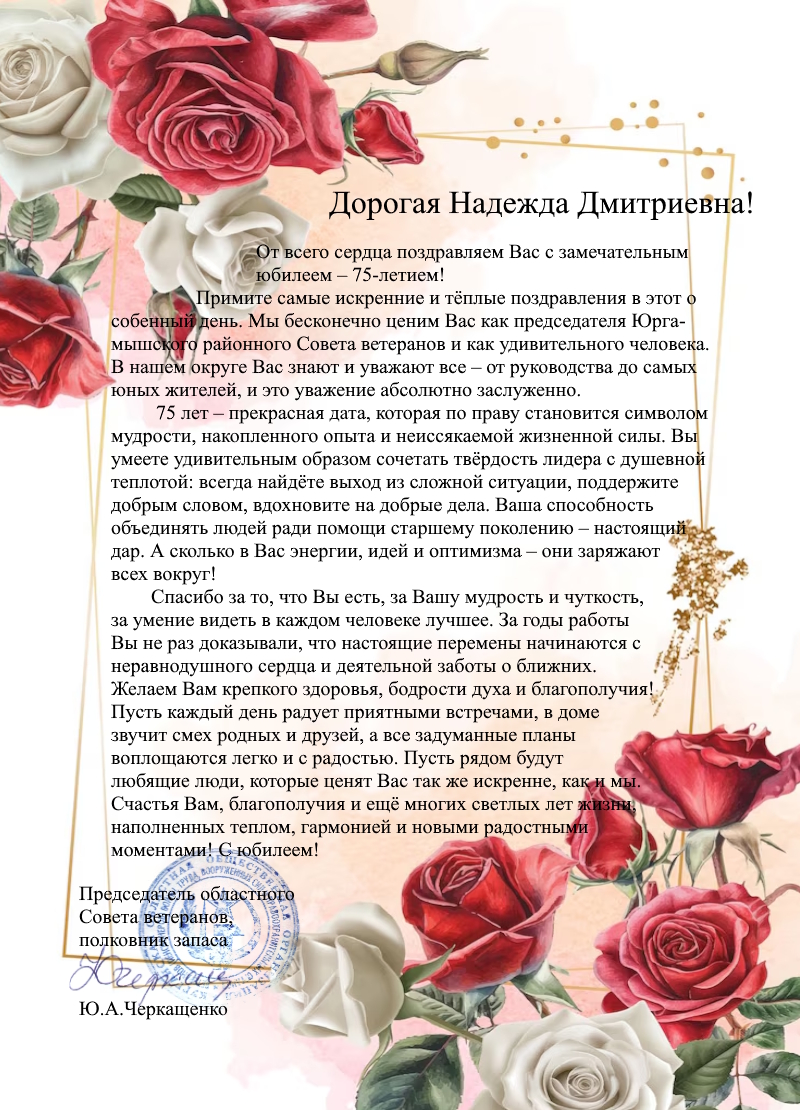Примите самые искренние и тёплые поздравления в этот особенный день. Мы бесконечно ценим Вас как председателя Юргамышского районного Совета ветеранов и как удивительного человека.