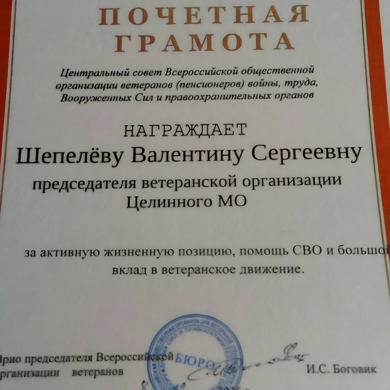 За полтора года волонтерской группой «Катюши» связано около 500 маскировочных сетей, изготовлено более 2000 окопных сетей, сшито 34 костюма для разведчиков, связано около 50 пледов и сшито более 200 подушечек для госпиталей. На передовую СВО передано более 500 пар теплых носков, закуплено лекарственных средств на более чем 300 тысяч рублей... И это лишь малая часть работы, которую координирует, организует, переживает за каждое дело руководитель ветеранской организации округа, волонтёр Валентина Сергеевна Шепёлева.