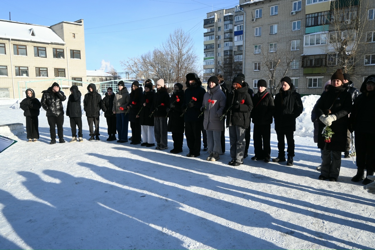 Участники мероприятия возложили цветы к мемориальному знаку, установленному на фасаде техникума. Затем собравшиеся почтили память героя минутой молчания, объединившей всех в едином порыве скорби и уважения.