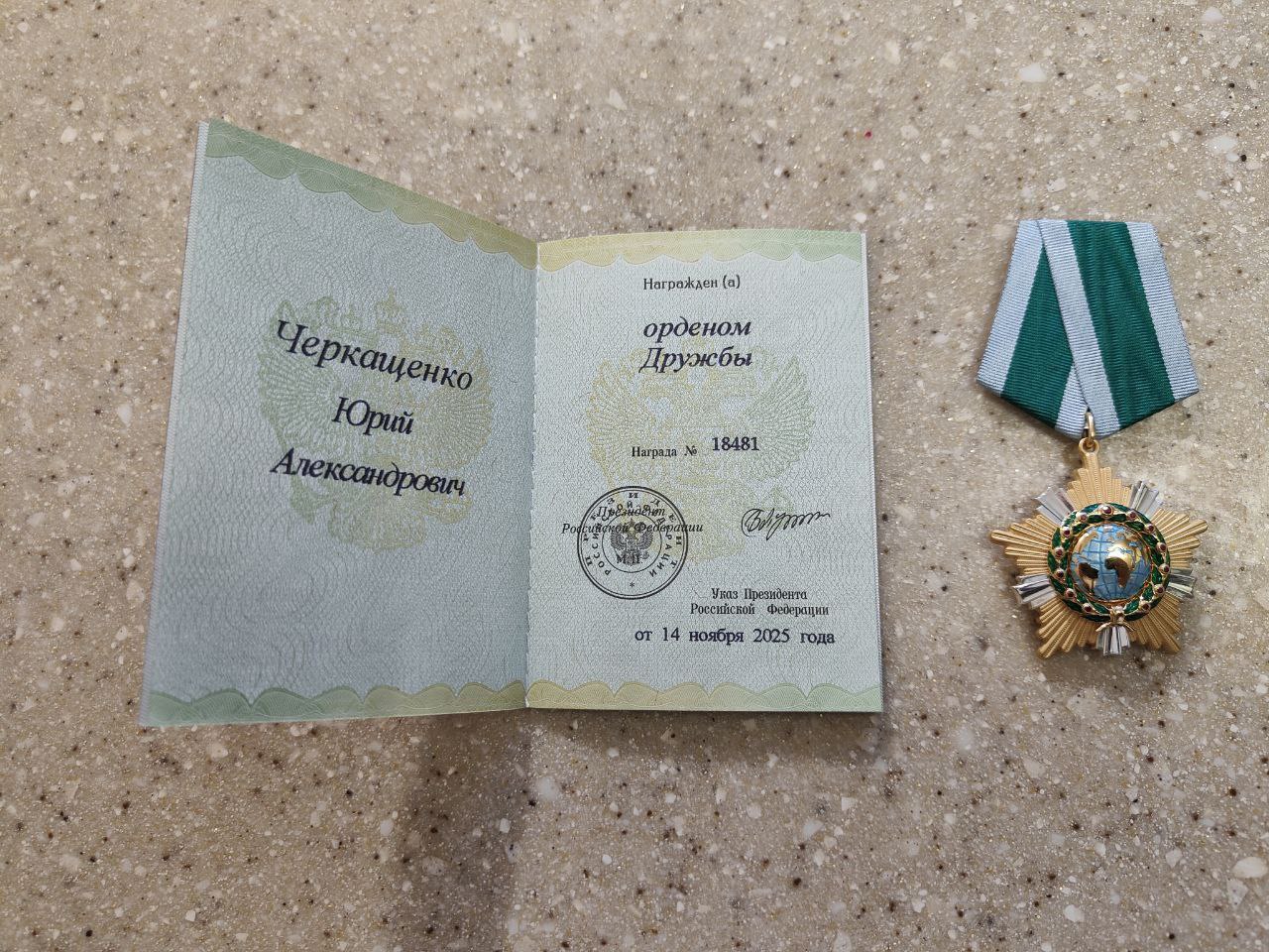 6 февраля в областной филармонии состоялось праздничное мероприятие, посвящённое 83-летию региона. Губернатор Вадим Шумков вручил курганцам государственные и региональные награды. Высокой государственной наградой - Орденом Дружбы - награжден Черкащенко Юрий Александрович, председатель Курганской областной организации Всероссийской общественной организации ветеранов (пенсионеров) войны, труда, Вооруженных Сил и правоохранительных органов, полковник запаса.