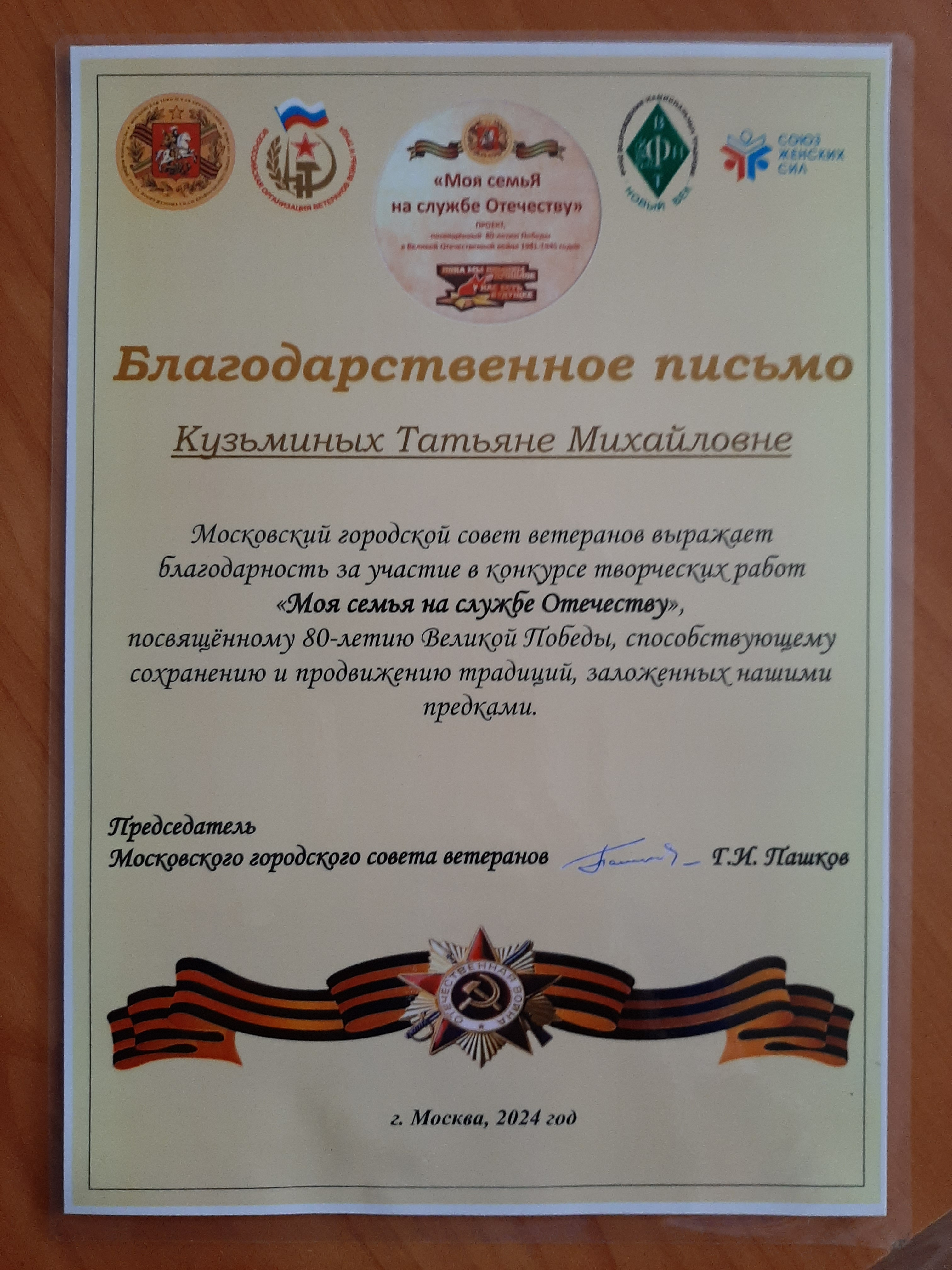 Московский городской Совет ветеранов выражает благодарность за участие в конкурсе Черкащенко Ю.А. председателю Курганской областной организации ветеранов